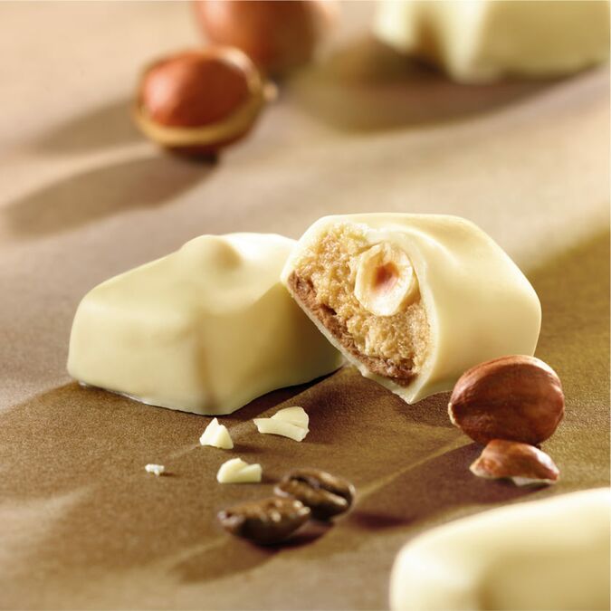 Λευκή σοκολάτα, κρέμα βουτύρου με καφέ 100% arabica, πραλίνα και ένα ολόκληρο φουντούκι.